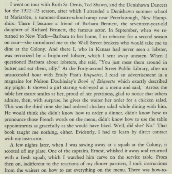 In the book — which is a recommended read — she details how she had to learn proper big-city restaurant etiquette early on, and how the waiters at The Colony restaurant in NYC taught her how to eat various items on the menu. The Colony was a fashionable haunt of Cafe Society in NYC in the 1920’s — located on 61st Street off Madison Avenue.