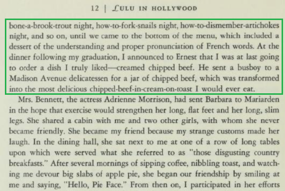 The amazing thing to come out of this snippet — and reason for this article — is her disclosure to Ernest the captain of the waiter staff , on the dinner following her graduation, that she was “at last going to order a dish I truly liked — creamed chipped beef. He sent a busboy to a Madison Avenue delicatessen for a jar of chipped beef, which was transformed into the most delicious chipped-beef-in-cream-on-toast I would ever eat.”