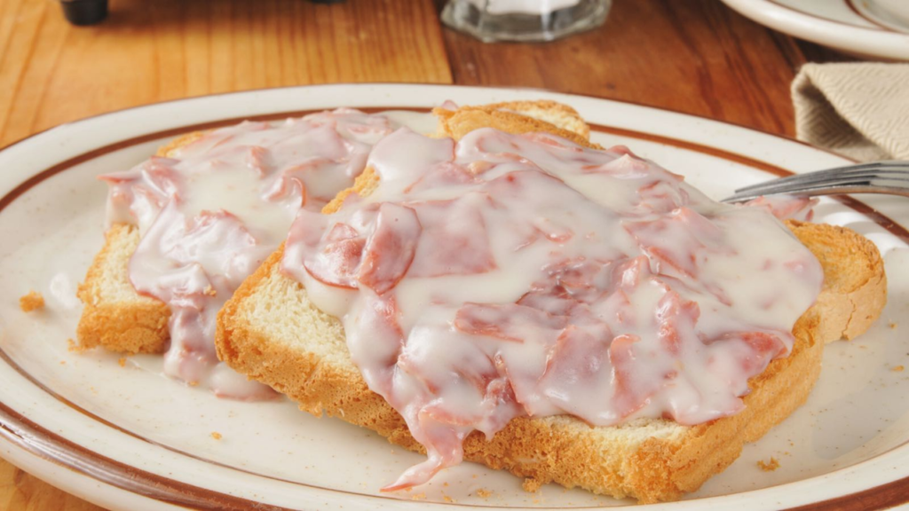 It consists of a creamy white gravy on dried, salted beef served over slices of toasted bread.