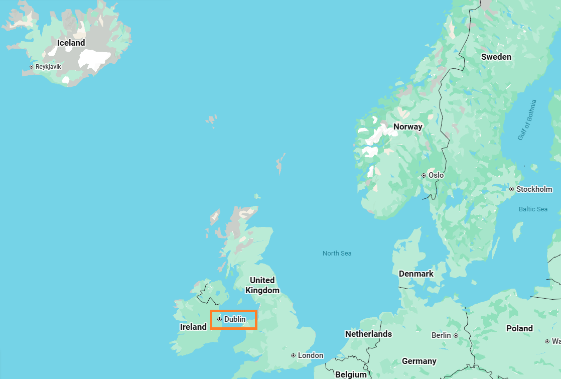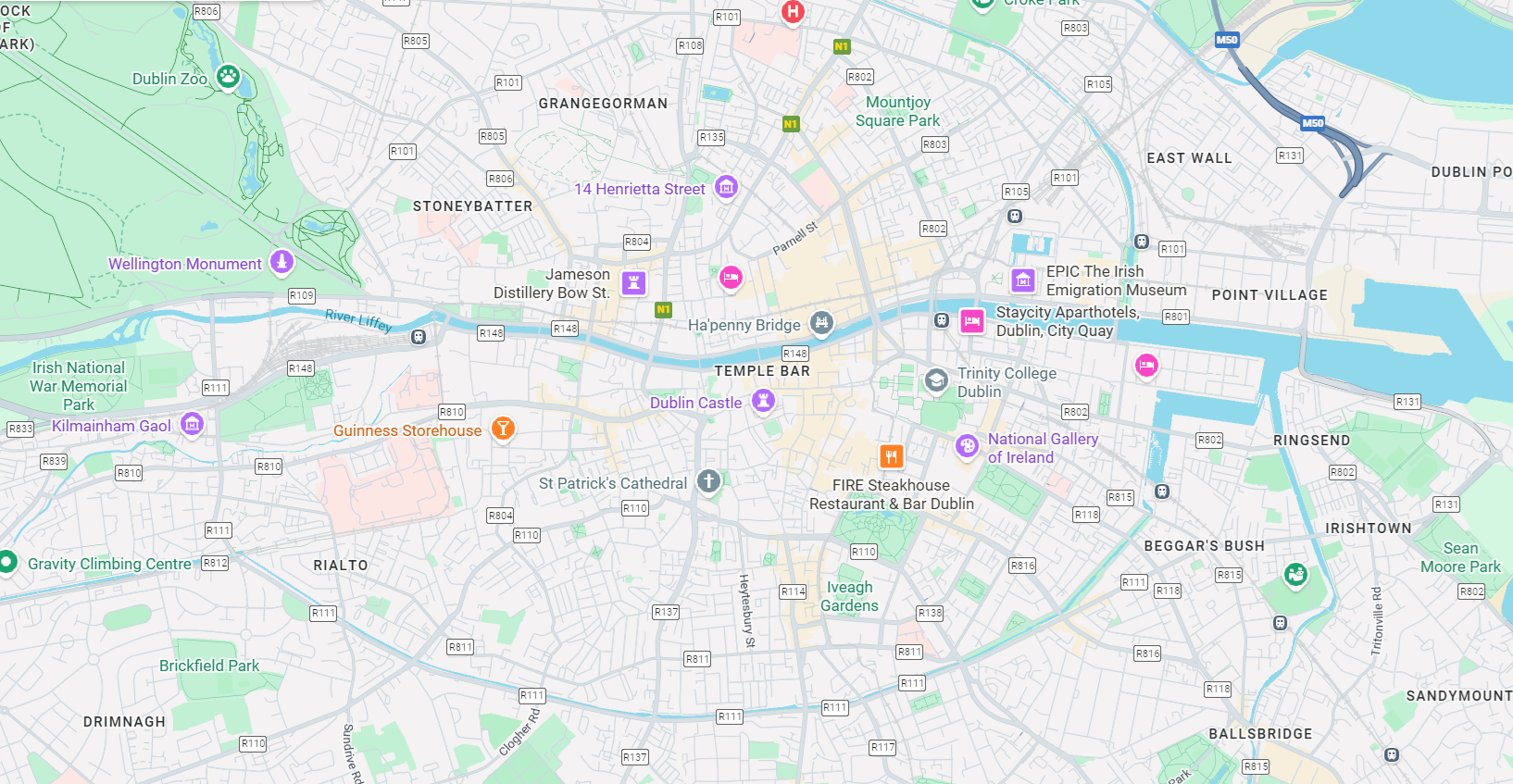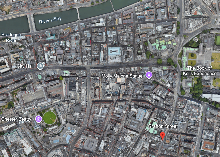 The most known street in Dublin for music busking is Grafton Street — which is about 10-12 blocks to the south of the Temple Bar section and the River (see red marker below).