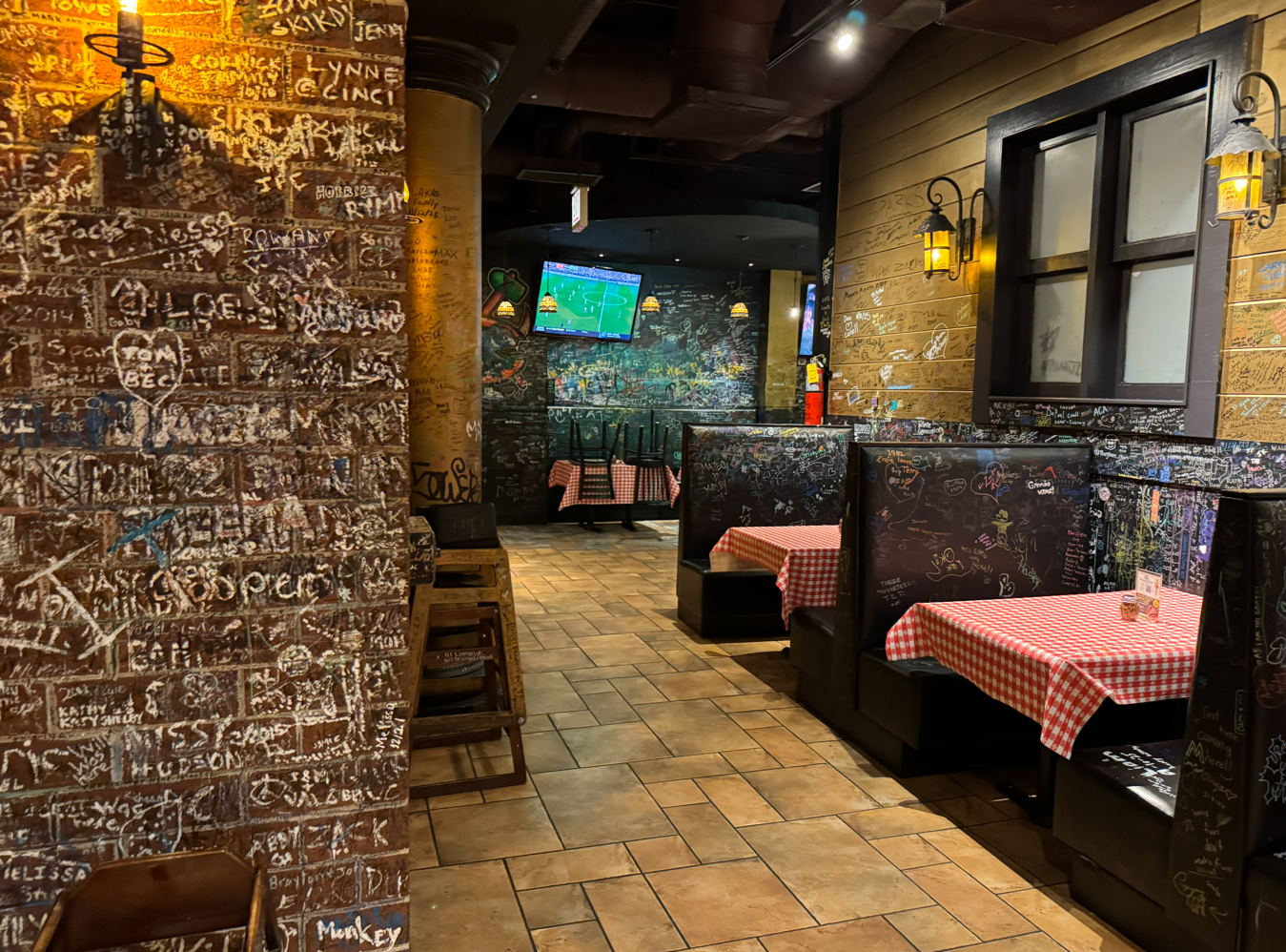Geno’s is downtown. The restaurant allows you to write on its walls, and provides magic markers for you to do so. So people have written all over it — on its ceilings, walls, etc. The pizza was thick and the sauce was amazing.