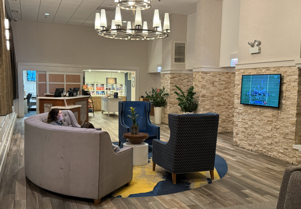 The Homewood Suites’ hotel lobby is on the 6th floor and has amazing views of the Trump Tower and other downtown buildings. Note this is the Homewood Suites in downtown (E Grand St) — there are 3 Homewood Suites in Chicago.